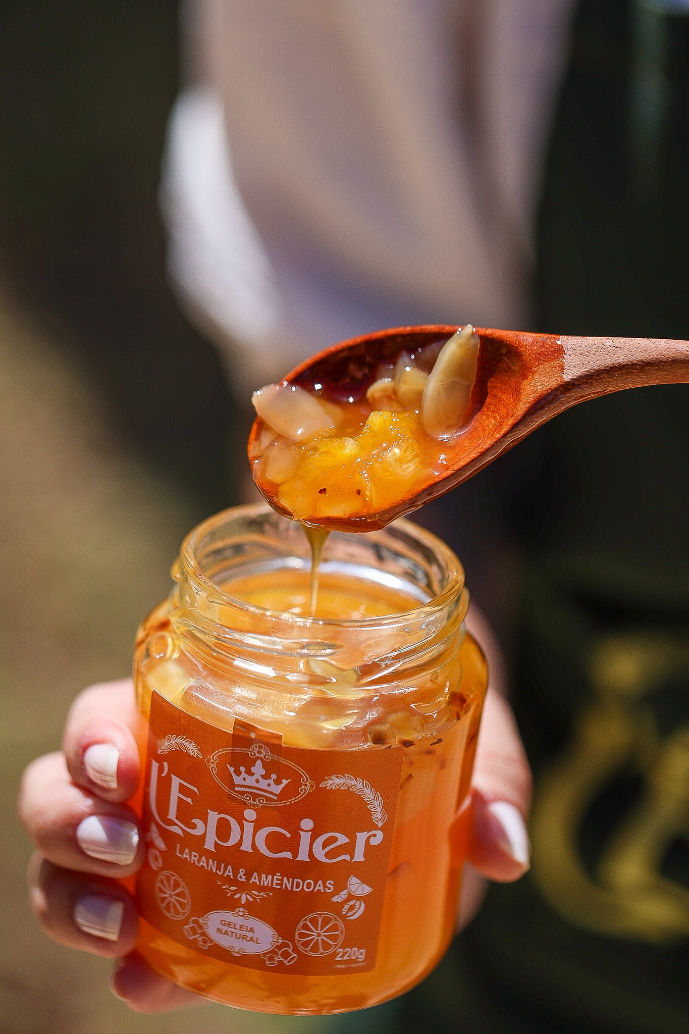 Geleia preparada à base de laranjas selecionadas e amêndoas laminadas. Um delicioso acompanhamento para queijos, pães, bolos e sobremesas, com equilíbrio entre a acidez cítrica da fruta e a suavidade das amêndoas.